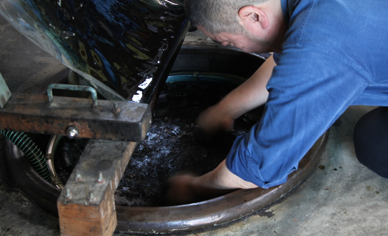 当工房の藍瓶は徳島県鳴門の大谷焼の瓶です。容量は約300リットルです。この技法は大量の本灰を必要とするため、良質な木灰の入手が難しくなった現在は木灰の代用として化学薬品を使用する工房もあります。それでは「すくも」を使用するだけの価値が半減してしまいますし、化学薬品を使用した藍染料では素手での作業は恐ろしくて出来ません。